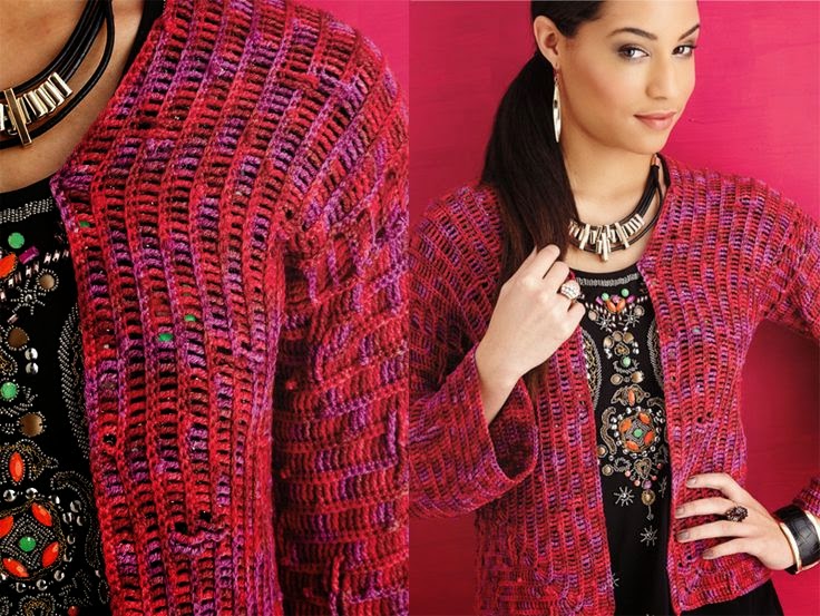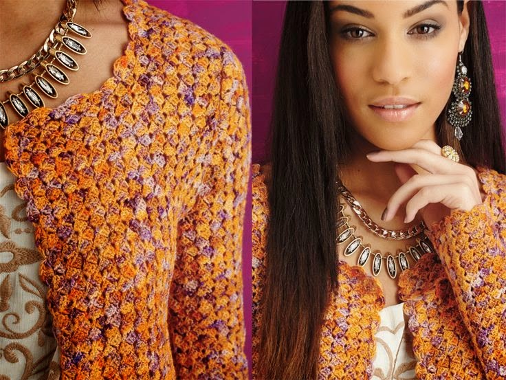 Costure os ombros. Costure a gola no decote das costas. Faça ao logo das frentes, gola e cavas o bico seguindo o gráfico.
